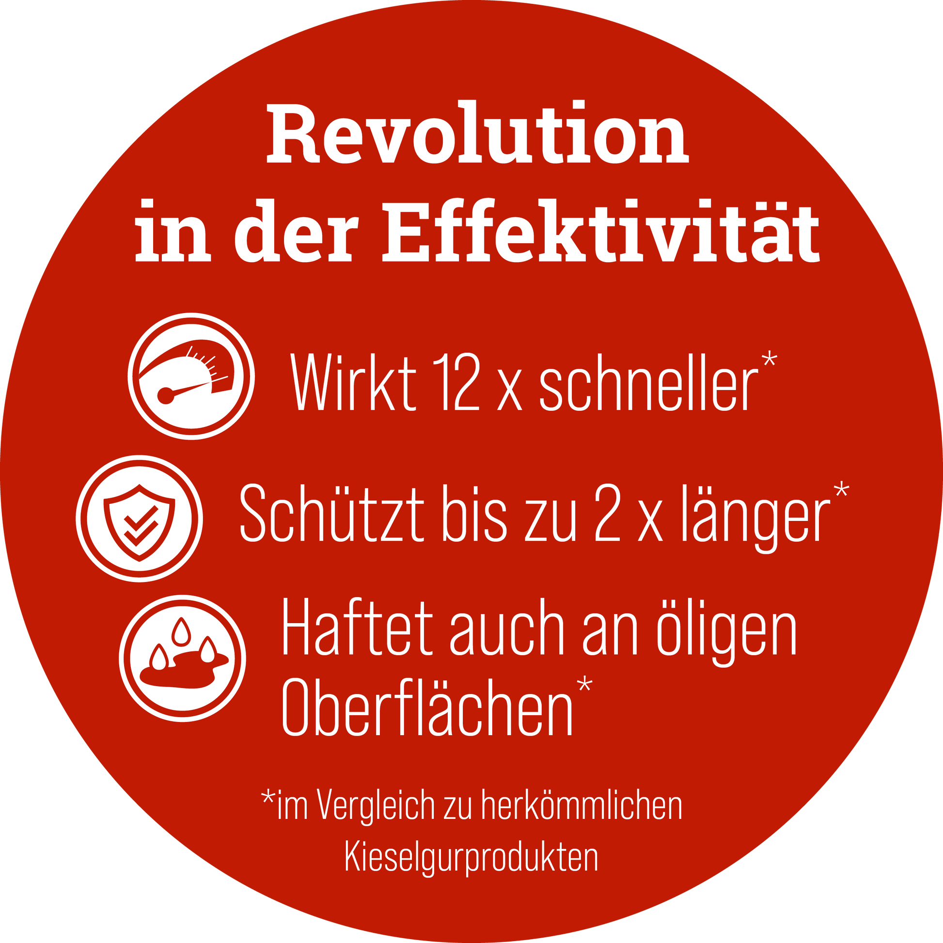 Fossil Shield® instant white easy bewirkt bei Kontakt Austrocknung von Roten Vogelmilben durch die Absorbtion der äußeren schützenden Wachsschicht. Wirkt bis zu 12 x schneller und schützt bis zu 2 x länger als herkömmliche Kieselgurprodukte.